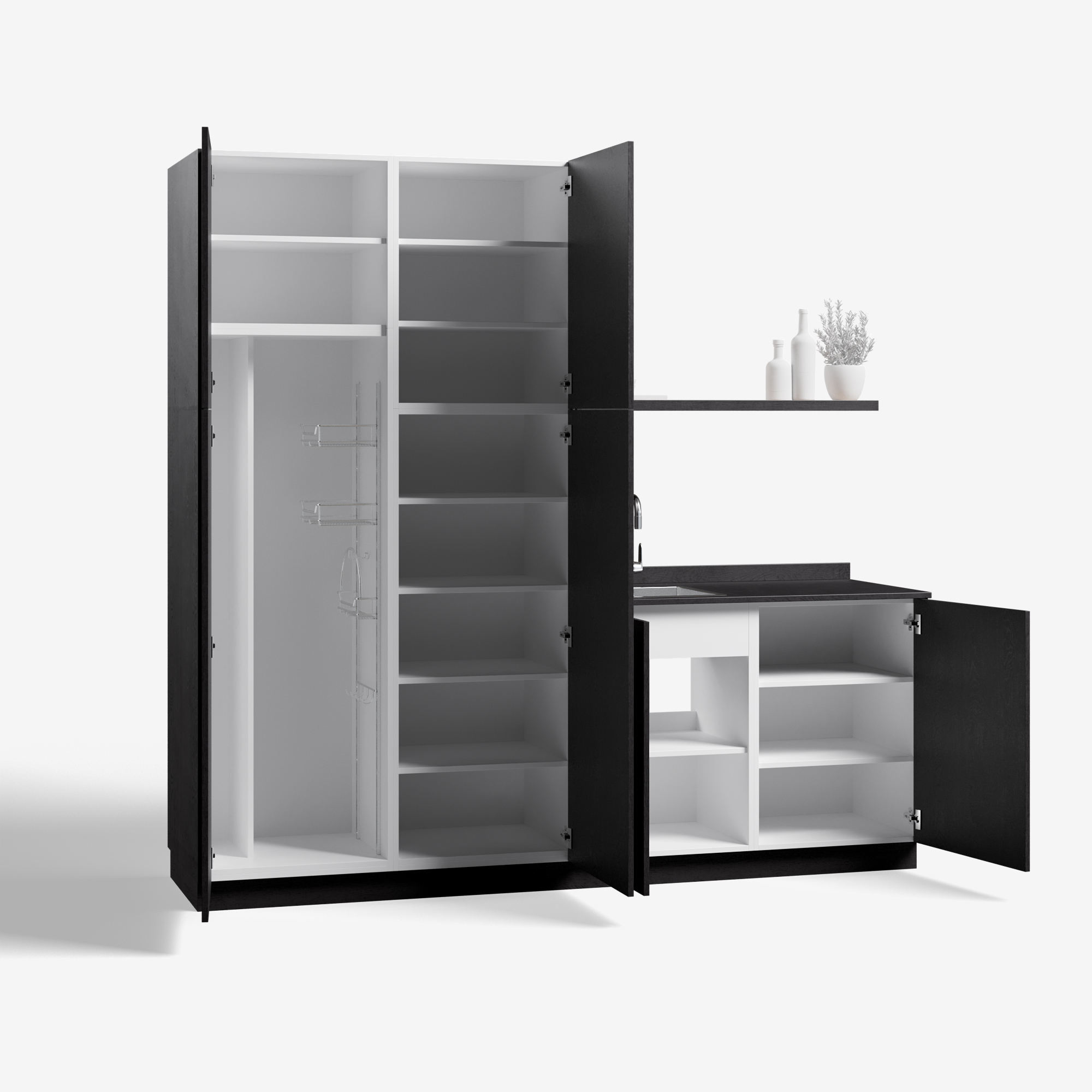 Met Chip houd je alles netjes opgeruimd. De hoge kast biedt ruimte aan je strijkplank en toebehoren, aan een bezem, een dweil, stoffer en blik en meer van die lang, vaak lastig op te bergen huishoudelijke artikelen. Deze bijkeukenkast is er helemaal op ingericht.